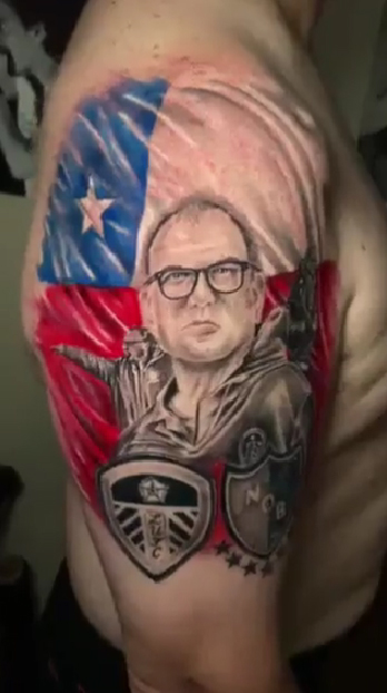 A través de su cuenta de Twitter, Luis Mora, quién escribió el libro «Marcelo Bielsa el día que todo cambió», compartió un video en el que se puede ver la impactante imagen que el hombre lleva en su brazo izquierdo. En el diseño aparece el técnico del Leeds con una bandera de Chile flameando detrás. Además tiene el escudo del Leeds, al cual arribó en 2018 y logró el histórico ascenso a la Premier League y el de Newell’s donde dirigió de 1990 a 1992.